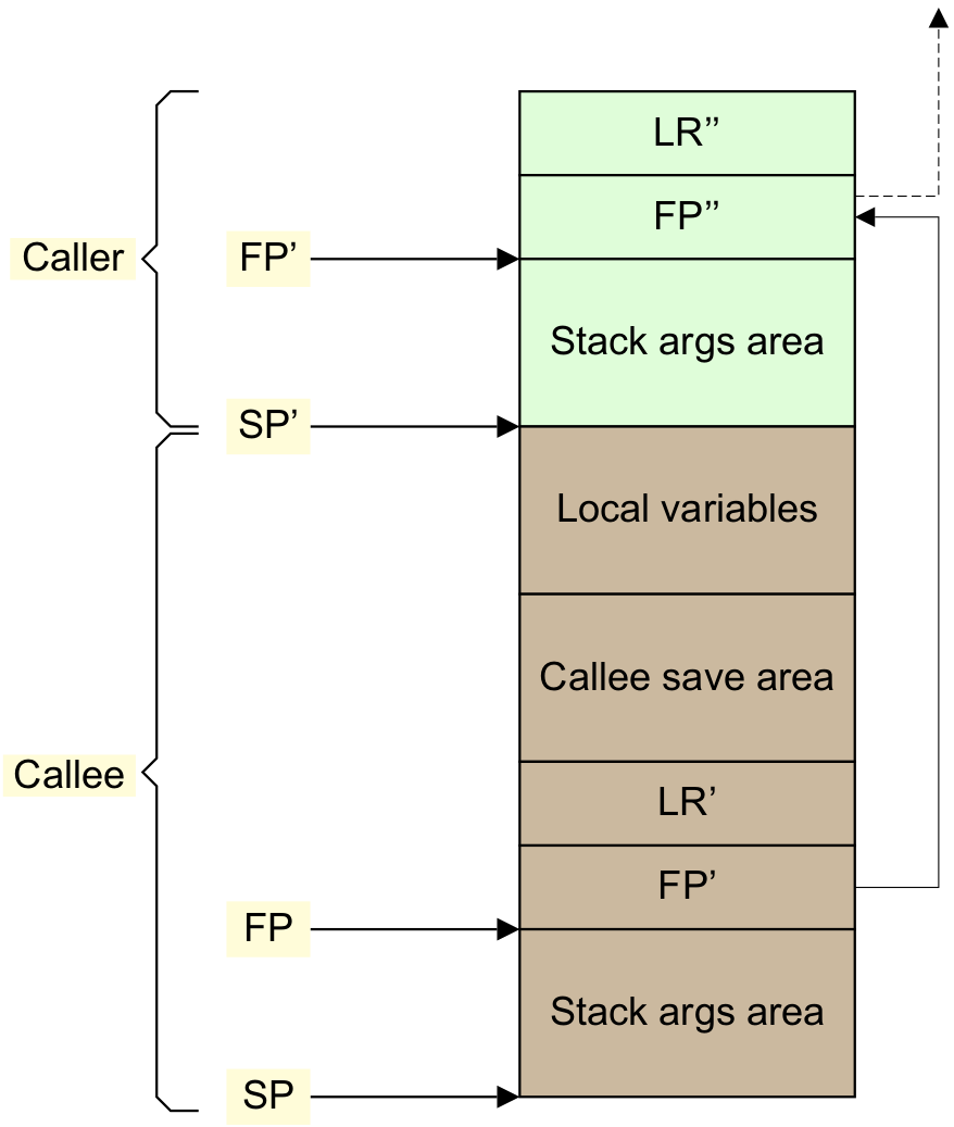 Conforming code shall construct a linked list of stack-frames. Each frame shall link to the frame of its caller by means of a frame record of two 64-bit values on the stack (independent of the data model). The frame record for the innermost frame (belonging to the most recent routine invocation) shall be pointed to by the frame pointer register (FP). The lowest addressed double-word shall point to the previous frame record and the highest addressed double-word shall contain the value passed in LR on entry to the current function […]. The location of the frame record within a stack frame is not specified.